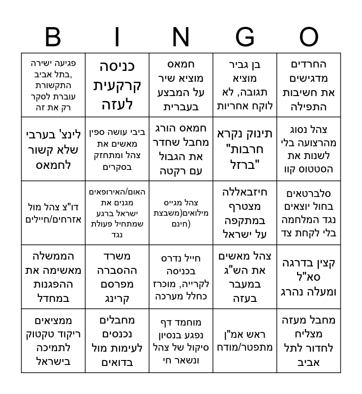 This bingo card has a free space and 24 words: משרד ההסברה מפרסם קרינג, מחבלים נכנסים לעימות מול בדואים, חמאס הורג מחבל שחדר את הגבול עם רקטה, ממציאים ריקוד טקטוק לתמיכה בישראל, החרדים מדגישים את חשיבות התפילה, פגיעה ישירה בתל אביב, התקשורת עוברת לסקר רק את זה, לינצ' בערבי שלא קשור לחמאס, כניסה קרקעית לעזה, חיזבאללה מצטרף במתקפה על ישראל, חייל נדרס בכניסה לקרייה, מוכרז כחלל מערכה, תינוק נקרא "חרבות ברזל", דו"צ צהל מול אזרחים/חיילים, צהל מאשים את הש"ג במעבר בעזה, קצין בדרגה סא"ל ומעלה נהרג, ביבי עושה ספין מאשים את צהל ומתחזק בסקרים, ראש אמ"ן מתפטר/מודח, סלברטאים בחול יוצאים נגד המלחמה בלי לקחת צד, חמאס מוציא שיר על המבצע בעברית, צהל נסוג מהרצועה בלי לשנות את הסטטוס קוו, האום/האירופאים מגנים את ישראל ברגע שמתחיל פעולת נגד, מחבל מעזה מצליח לחדור לתל אביב, הממשלה מאשימה את ההפגנות במחדל, בן גביר מוציא תגובה, לא לוקח אחריות and מוחמד דף נפגע בנסיון סיקול של צהל ונשאר חי.