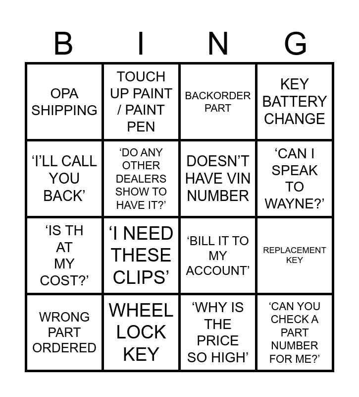 This bingo card has 16 words: WHEEL LOCK KEY, REPLACEMENT KEY, BACKORDER PART, OPA SHIPPING, ‘IS THAT MY COST?’, TOUCH UP PAINT / PAINT PEN, ‘BILL IT TO MY ACCOUNT’, ‘WHY IS THE PRICE SO HIGH’, ‘I’LL CALL YOU BACK’, ‘DO ANY OTHER DEALERS SHOW TO HAVE IT?’, WRONG PART ORDERED, KEY BATTERY CHANGE, ‘I NEED THESE CLIPS’, ‘CAN I SPEAK TO WAYNE?’, DOESN’T HAVE VIN NUMBER and ‘CAN YOU CHECK A PART NUMBER FOR ME?’.
