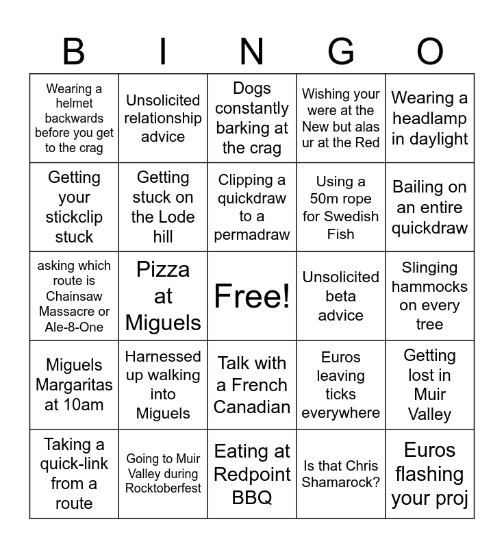 This bingo card has a free space and 24 words: Harnessed up walking into Miguels, Going to Muir Valley during Rocktoberfest, Clipping a quickdraw to a permadraw, Taking a quick-link from a route, Wearing a headlamp in daylight, Wearing a helmet backwards before you get to the crag, Getting your stickclip stuck, Unsolicited relationship advice, Unsolicited beta advice, Talk with a French Canadian, Using a 50m rope for Swedish Fish, asking which route is Chainsaw Massacre or Ale-8-One, Euros leaving ticks everywhere, Getting lost in Muir Valley, Getting stuck on the Lode hill, Is that Chris Shamarock?, Slinging hammocks on every tree, Dogs constantly barking at the crag, Bailing on an entire quickdraw, Pizza at Miguels, Euros flashing your proj, Miguels Margaritas at 10am, Wishing your were at the New but alas ur at the Red and Eating at Redpoint BBQ.