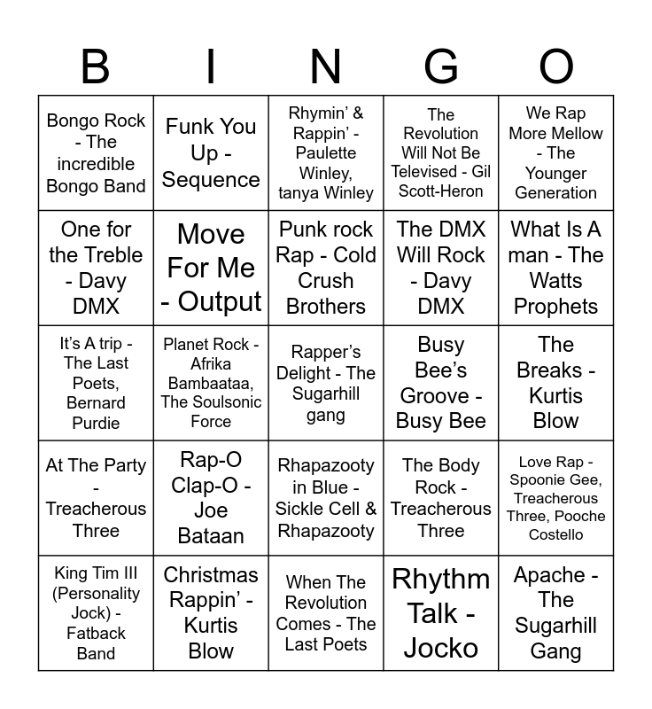This bingo card has 43 words: Free!, Rapper’s Delight - The Sugarhill gang, Superrappin’ - Grandmaster Flash & The Furious Five, King Tim III (Personality Jock) - Fatback Band, Rappin and Rockin the House - Funky Four Plus One More, Rhythm Talk - Jocko, Rhymin’ & Rappin’ - Paulette Winley, tanya Winley, Lookin’ Good - Eddie Cheba, We Rap More Mellow - The Younger Generation, Christmas Rappin’ - Kurtis Blow, The Revolution Will Not Be Televised - Gil Scott-Heron, Busy Bee’s Groove - Busy Bee, Rhapazooty in Blue - Sickle Cell & Rhapazooty, Rap-O Clap-O - Joe Bataan, And you Know That - TJ Swan, When The Revolution Comes - The Last Poets, Ho Chi Minh - The Last Poets, Bernard Purdie, It’s A trip - The Last Poets, Bernard Purdie, Picture of Blue - The Last Poets, What Is A man - The Watts Prophets, Funk You Up - Sequence, Doctor Love & Sister Love Rap - Doctor Love & Sister Love, That’s The Joint - Funky 4 + 1, Bongo Rock - The incredible Bongo Band, Subway Theme - Grand Wizard Theodore, The Breaks - Kurtis Blow, Rockin’ It - The Fearless Four, Sucker M.C.’s - Run-D.M.C., The Body Rock - Treacherous Three, At The Party - Treacherous Three, Feel The Heartbeat (Have Fun) - Treacherous Three, Love Rap - Spoonie Gee, Treacherous Three, Pooche Costello, The New Rap Language - Spoonie Gee, Treacherous Three, Pooche Costello, Planet Rock - Afrika Bambaataa, The Soulsonic Force, Rapper’s Reprise - The Sugarhill gang, Here I Am - The Sugarhill Gang, Apache - The Sugarhill Gang, Punk rock Rap - Cold Crush Brothers, One for the Treble - Davy DMX, The DMX Will Rock - Davy DMX, Lets Smurph Across the Surf - The Micronawts, Move For Me - Output and The Message - Grandmaster Flash & The Furious Five.