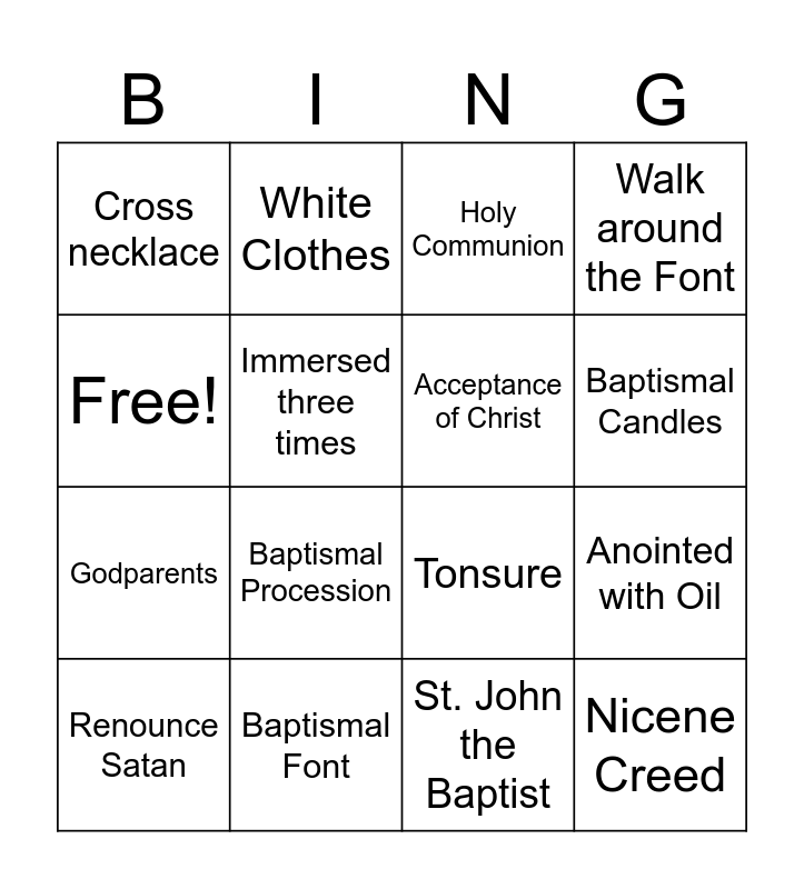 This bingo card has 16 words: Baptismal Font, Anointed with Oil, Holy Communion, Cross necklace, Godparents, White Clothes, Tonsure, St. John the Baptist, Free!, Immersed three times, Renounce Satan, Walk around the Font, Baptismal Procession, Baptismal Candles, Acceptance of Christ and Nicene Creed.
