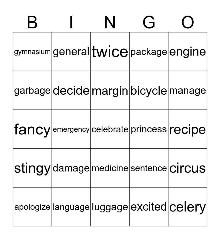 This bingo card has a free space and 24 words: damage, language, margin, apologize, engine, gymnasium, garbage, general, princess, medicine, bicycle, fancy, sentence, circus, decide, excited, recipe, twice, manage, emergency, celery, stingy, package and luggage.