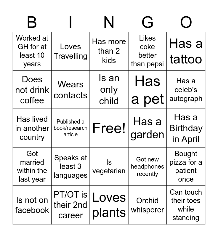 This bingo card has a free space and 24 words: Speaks at least 3 languages, PT/OT is their 2nd career, Is an only child, Is not on facebook, Has a tattoo, Worked at GH for at least 10 years, Does not drink coffee, Loves Travelling, Has a garden, Is vegetarian, Has a pet, Has lived in another country, Got new headphones recently, Bought pizza for a patient once, Wears contacts, Orchid whisperer, Has a Birthday in April, Has more than 2 kids, Has a celeb's autograph, Published a book/research article, Can touch their toes while standing, Got married within the last year, Likes coke better than pepsi and Loves plants.
