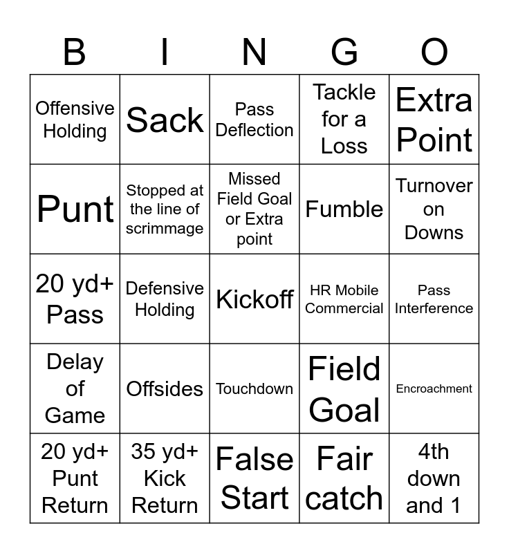 This bingo card has a free space and 28 words: Encroachment, Interception, Fumble, Fair catch, Punt, Pass Deflection, Sack, Delay of Game, HR Mobile Commercial, 20 yd+ Punt Return, 20 yd+ Pass, Tackle for a Loss, 35 yd+ Kick Return, False Start, Turnover on Downs, 3rd and 5, Offsides, Stopped at the line of scrimmage, Missed Field Goal or Extra point, Touchdown, Offensive Holding, 30 yd+ Play, 4th down and 1, Defensive Holding, Pass Interference, Field Goal, Extra Point and 10 yd+ Run.