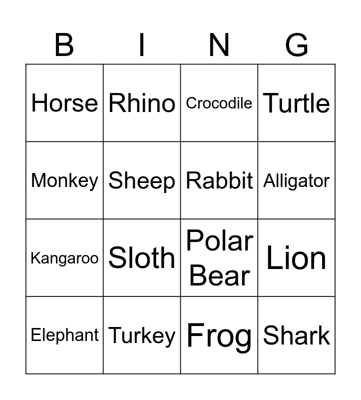 This bingo card has 32 words: Dog, Cat, Lion, Tiger, Shark, Rabbit, Monkey, Giraffe, Rhino, Hippo, Alligator, Crocodile, Mouse, Chicken, Turkey, Whale, Dolphin, Polar Bear, Fox, Cheetah, Rat, Snake, Frog, Eagle, Elephant, Turtle, Kangaroo, Sheep, Horse, Goat, Gorilla and Sloth.