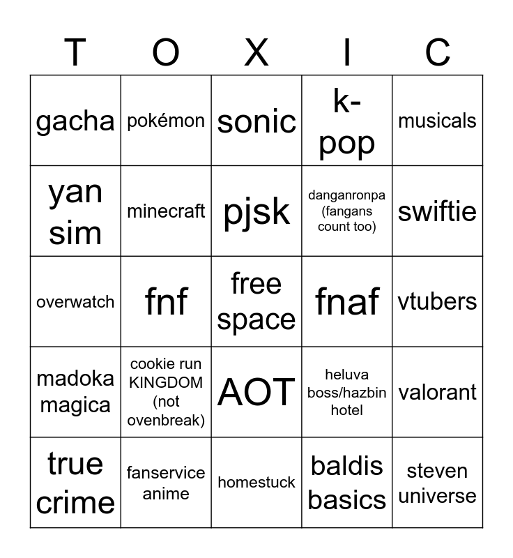 This bingo card has a free space and 27 words: heluva boss/hazbin hotel, country humans/hetalia, danganronpa (fangans count too), homestuck, yan sim, sonic, pokémon, madoka magica, fnaf, valorant, overwatch, k-pop, true crime, fanservice anime, swiftie, dsmp (ew), minecraft, pjsk, cookie run KINGDOM (not ovenbreak), gacha, vtubers, baldis basics, fnf, steven universe, AOT, musicals and toh.