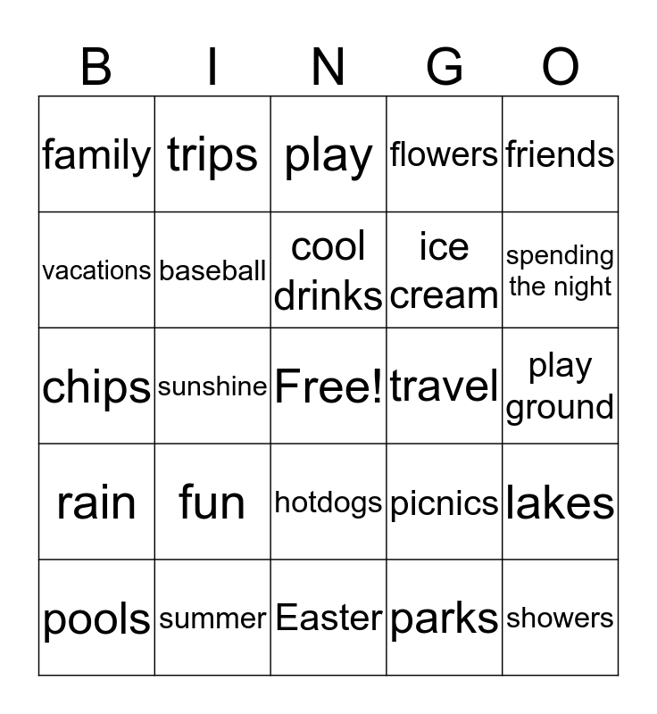 This bingo card has a free space and 24 words: fun, summer, cool drinks, pools, friends, family, vacations, trips, travel, hotdogs, ice cream, chips, picnics, lakes, baseball, parks, play ground, play, spending the night, sunshine, showers, rain, flowers and Easter.