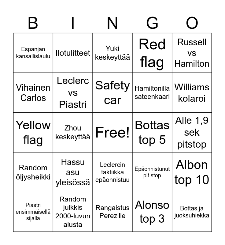 This bingo card has a free space and 24 words: Hassu asu yleisössä, Random julkkis 2000-luvun alusta, Safety car, Piastri ensimmäisellä sijalla, Russell vs Hamilton, Espanjan kansallislaulu, Vihainen Carlos, Ilotulitteet, Bottas top 5, Leclercin taktiikka epäonnistuu, Hamiltonilla sateenkaari, Yellow flag, Epäonnistunut pit stop, Albon top 10, Leclerc vs Piastri, Alonso top 3, Alle 1,9 sek pitstop, Yuki keskeyttää, Williams kolaroi, Zhou keskeyttää, Bottas ja juoksuhiekka, Random öljysheikki, Red flag and Rangaistus Perezille.