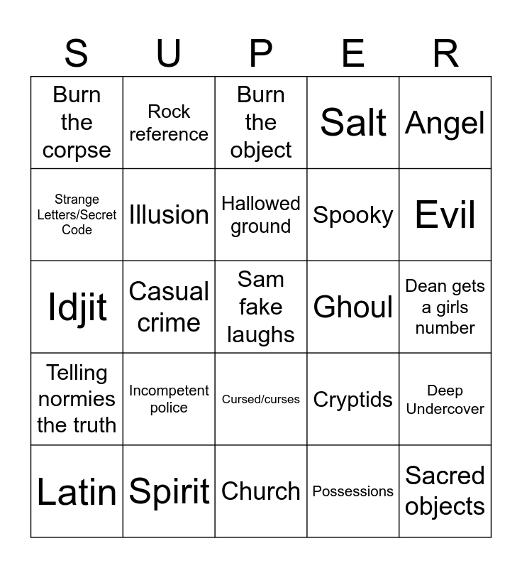 This bingo card has 70 words: Free!, Dean gets a girls number, Sam hates the nickname Sammy, Ghost, Spirit, Demon, Salt, Wrought iron/iron, Angel, Prank, Deep Undercover, Haunted object, Burn the corpse, Burn the object, Exorcism, Casual crime, Cursed/curses, Spooky, Painted/drawn symbol/s, Telling normies the truth, Ghoul, Cryptids, Evil, Silver, Pagan religion, God/Gods, Urban legend, Myth, Possessions, Knocked out/Drugged, Rock reference, Evil hunters, Split up the party, Ancient evil, Reference the/an apocalypse, Other hunters, Dean being a goof, Sam being smart, Special ammo, Strange Letters/Secret Code, Sacred objects, Incompetent police, Sam fake laughs, Object that wards off evil, Magic/black magic, Illusion, Latin, Mainstream lore is false, Sacrifice, Holy water, Research, Fake haunting/evil, Dean being an angy boi, Sam being an angy boi, Church, Sacred ground, Hallowed ground, Summoning an entity, Sam having a premonition, Witch, Idjit, Bobby being sigma, Better call Bobby, Portal to another place, Protection circle/symbol/ward, Sam being psychic, Satanist, Name of the show, Sucker punch and Better take a look at this.