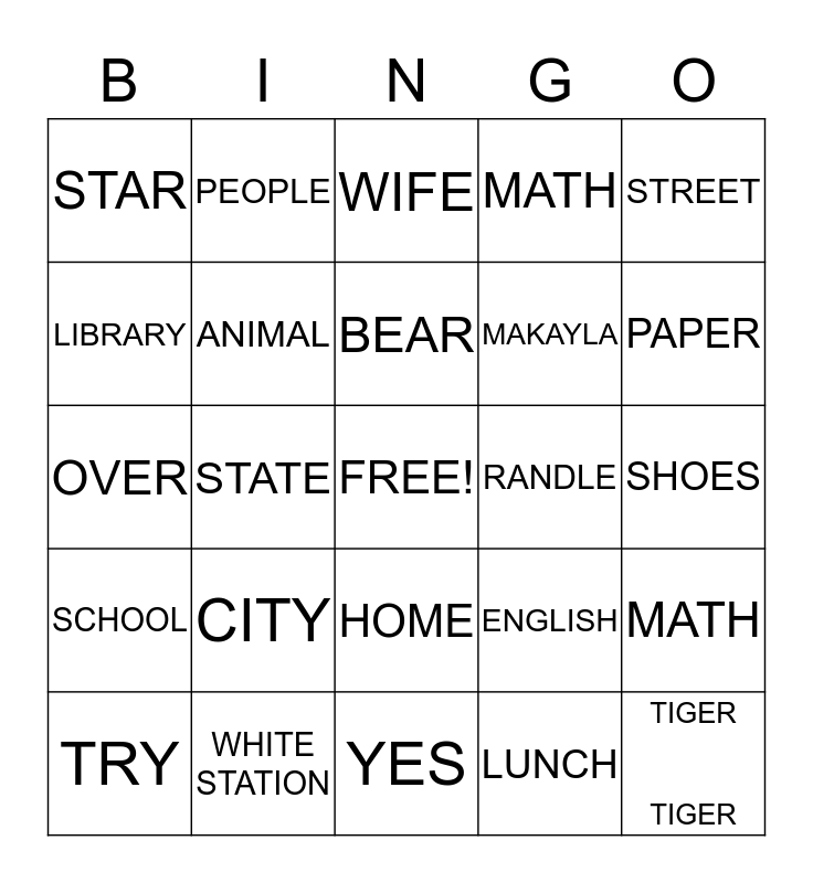 This bingo card has a free space and 24 words: CITY, WHITE STATION, BEAR, TRY, STREET, STAR, LIBRARY, PEOPLE, RANDLE, HOME, MAKAYLA, OVER, ENGLISH, MATH, ANIMAL, LUNCH, SHOES, WIFE, PAPER, STATE, TIGER TIGER, SCHOOL, MATH and YES.