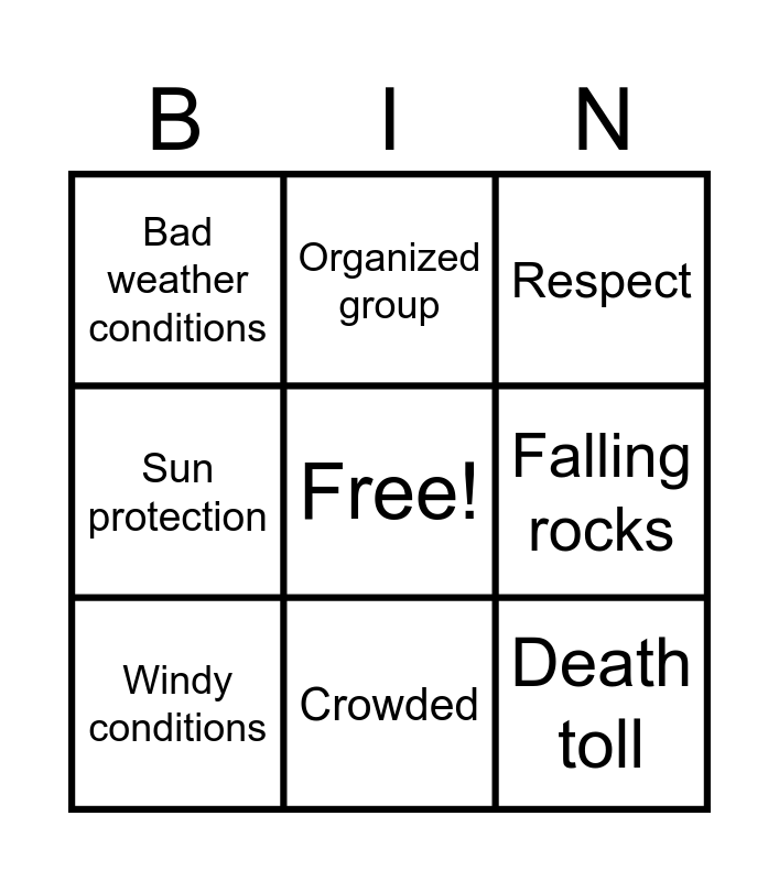 This bingo card has a free space and 24 words: Summit, Climbers, Crowded, Dangerous, Death toll, Bad weather conditions, Falling rocks, Organized group, Sociable experience, Solo, Confidence, Intrepid, Changeable weather, Cold, Windy conditions, Acclimatized, Altitude, Respect, Equipment, Extreme weather conditions, Layers, Queues, Sun protection and Burned.