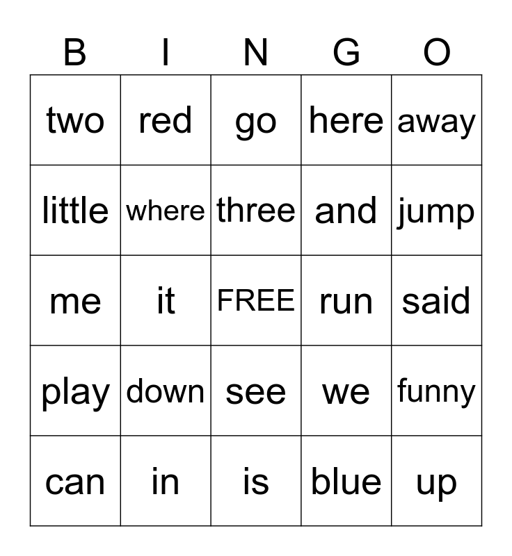 This bingo card has a free space and 41 words: I, down, make, run, up, play, it, find, and, funny, little, red, we, said, me, in, come, here, look, two, one, is, for, away, a, not, three, to, jump, play, big, go, blue, help, can, where, see, yellow, my, the and you.