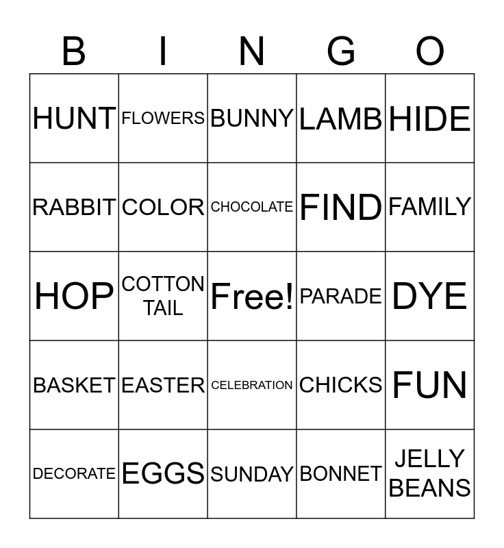 This bingo card has a free space and 24 words: EASTER, EGGS, CHOCOLATE, DECORATE, HIDE, HUNT, RABBIT, FLOWERS, PARADE, CELEBRATION, FIND, HOP, CHICKS, FUN, COLOR, BONNET, DYE, BUNNY, FAMILY, COTTON TAIL, JELLY BEANS, BASKET, LAMB and SUNDAY.