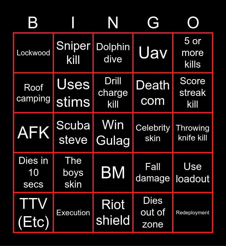 This bingo card has a free space and 24 words: The boys skin, Execution, Drill charge kill, TTV (Etc), 5 or more kills, Lockwood, Roof camping, Sniper kill, Celebrity skin, BM, Death com, AFK, Fall damage, Use loadout, Uses stims, Dies out of zone, Throwing knife kill, Dolphin dive, Score streak kill, Scuba steve, Redeployment, Dies in 10 secs, Uav and Riot shield.