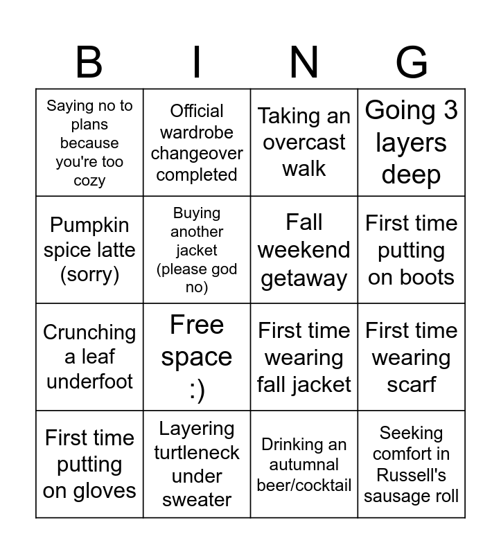 This bingo card has 16 words: Layering turtleneck under sweater, First time wearing scarf, Taking an overcast walk, Saying no to plans because you're too cozy, Crunching a leaf underfoot, Official wardrobe changeover completed, First time wearing fall jacket, Drinking an autumnal beer/cocktail, Pumpkin spice latte (sorry), Buying another jacket (please god no), First time putting on gloves, Going 3 layers deep, Free space :), First time putting on boots, Fall weekend getaway and Seeking comfort in Russell's sausage roll.