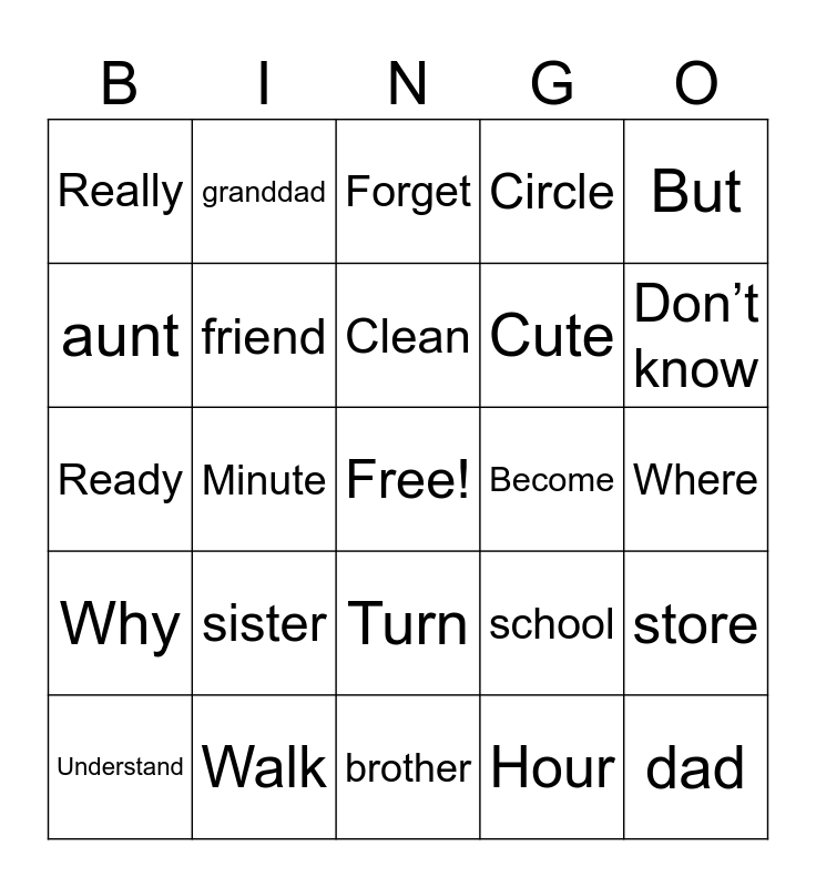 This bingo card has a free space and 52 words: mom, dad, family, brother, sister, grandma, granddad, uncle, aunt, baby, friend, home, store, school, work, Nice, Clean, Become, Different, But, Minute, Hour, Really, Cute, Funny, No, Yes/can, Know, Don’t know, Have, Star, Circle, Triangle, Birthday, Remember, Forget, Walk, Run, Who, What, When, Where, Why, How, Turn, Name, Meet, Ready, Word, Question, Understand and Favorite.