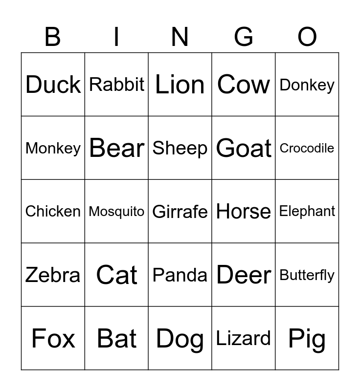 This bingo card has a free space and 24 words: Cat, Bat, Sheep, Fox, Donkey, Duck, Monkey, Rabbit, Horse, Panda, Goat, Chicken, Deer, Butterfly, Bear, Lizard, Elephant, Lion, Crocodile, Mosquito, Pig, Zebra, Cow and Dog.