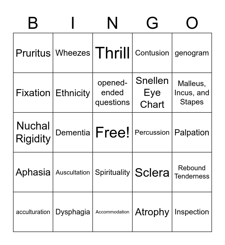 This bingo card has a free space and 39 words: Subjective Data, Objective Data, Evaluation, Ethnicity, acculturation, Spirituality, opened-ended questions, health literacy, genogram, Aphasia, Dementia, Contusion, Inspection, Palpation, Percussion, Auscultation, Breakthrough Pain, Pruritus, capillary refill, Sclera, Fixation, Accommodation, Snellen Eye Chart, Malleus, Incus, and Stapes, Menarche, Tuberculosis, Dyspnea, Crepitus, Crackles, Wheezes, Syncope, Edema, Thrill, Dysphagia, Atrophy, Clonus, Rebound Tenderness, Nuchal Rigidity and Menopause.