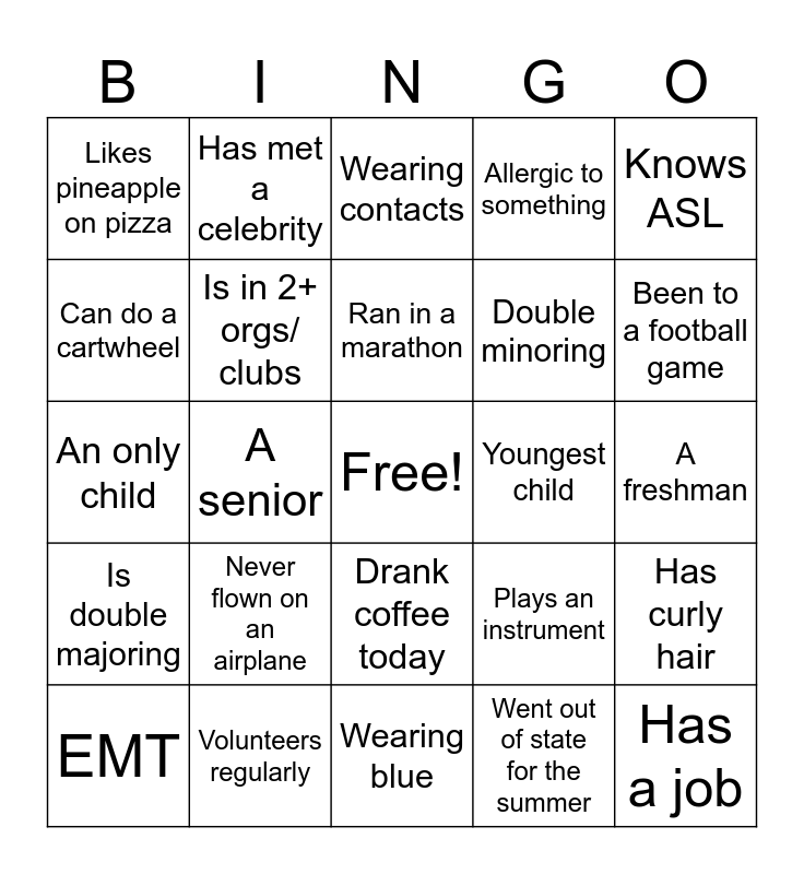 This bingo card has a free space and 24 words: Never flown on an airplane, Volunteers regularly, Ran in a marathon, EMT, Knows ASL, Likes pineapple on pizza, Can do a cartwheel, Has met a celebrity, Youngest child, Drank coffee today, Double minoring, An only child, Plays an instrument, Has curly hair, Is in 2+ orgs/ clubs, Went out of state for the summer, A freshman, Wearing contacts, Been to a football game, A senior, Has a job, Is double majoring, Allergic to something and Wearing blue.