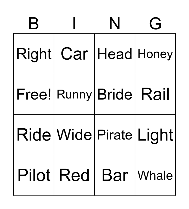 This bingo card has 16 words: Red, Light, Head, Right, Ride, Car, Pirate, Bar, Free!, Runny, Pilot, Honey, Wide, Rail, Bride and Whale.
