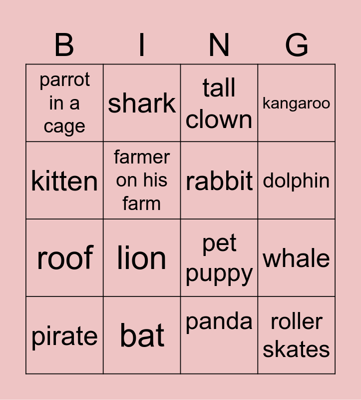 This bingo card has 17 words: panda, pirate, tall clown, parrot in a cage, lion, kangaroo, whale, rabbit, dolphin, farmer on his farm, bat, pet puppy, kitten, shark, roof, comic book and roller skates.