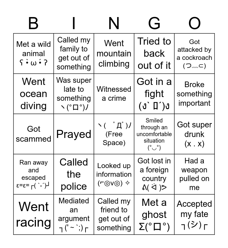 This bingo card has a free space and 27 words: Got lost in a foreign country ᕕ( ᐛ )ᕗ, Went sky diving, Got in a fight (ง` ロ´)ง, Called my friend to get out of something, Went ocean diving, Went mountain climbing, Called my family to get out of something, Ran away and escaped ε=ε=┌( `-´)┘, Smiled through an uncomfortable situation (°◡°), Had a weapon pulled on me, Got scammed, Tried to back out of it, Went racing, Mediated an argument ┐('~`;)┌, Broke something important, Owned up to my mistakes, Was super late to something ヽ(°ロ°)ノ, Witnessed a crime, Called the police, Met a wild animal ʕ •̀ ω •́ ʔ, Got super drunk (x . x), Met a ghost Σ(°ロ°), Prayed, Accepted my fate ┐(シ)┌, Looked up information (⌐◎v◎) ✧, Got attacked by a cockroach (つ﹏⊂) and Spent too much money (╯°□°)╯$.