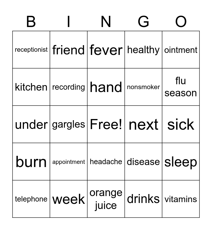 This bingo card has a free space and 29 words: telephone, throat, gargles, shots, receptionist, fever, recording, appointment, next, week, sick, vitamins, orange juice, drinks, flu season, sore, headache, burn, ointment, under, disease, lung cancer, nonsmoker, kitchen, healthy, friend, sleep, hand and oil.