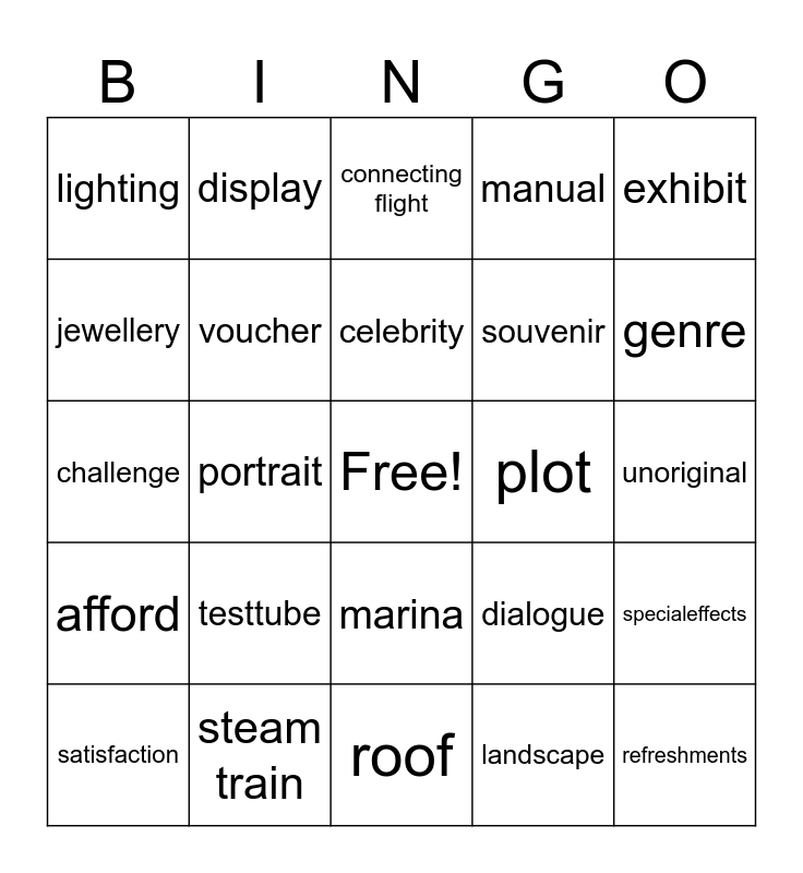 This bingo card has a free space and 50 words: flipflops, refreshments, castle, roof, testtube, thermometer, display, stall, jewellery, accessories, voucher, manual, specialeffects, dialogue, cooker, equipment, celebrity, plot, blog, exhibit, portrait, landscape, lighting, souvenir, picnic, trail, genre, audience, connecting flight, marina, underground, cancelled flight, delayed flight, boarding gate, steam train, trolley, straightforward, appealing, predictable, unoriginal, impressive, tricky, stunning, keen on, satisfaction, challenge, tempted, struggle, afford and tough.