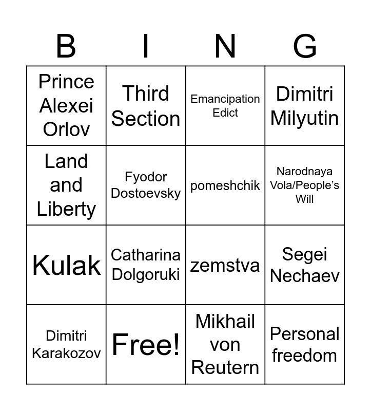 This bingo card has 22 words: Free!, Autocracy, Orthodoxy, Nationality, Third Section, Crimean War, Fyodor Dostoevsky, pomeshchik, Prince Alexei Orlov, Emancipation Edict, zemstva, Personal freedom, Kulak, Dimitri Milyutin, Nikolai Milyutin, Ivan Turgenev, Mikhail von Reutern, Pale of settlement, Segei Nechaev, Dimitri Karakozov, Catharina Dolgoruki, Land and Liberty, Narodnaya Vola/People’s Will and Mikchail Loris- Melikov.