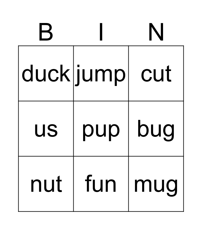 This bingo card has a free space and 17 words: bus, run, cut, duck, cub, us, sun, nut, fun, bug, tug, bun, mug, jump, cup, up and gum.