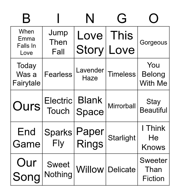 This bingo card has a free space and 32 words: Delicate, Dress, Electric Touch, Enchanted, End Game, Fearless, Gorgeous, I Think He Knows, Jump Then Fall, King Of My Heart, Lavender Haze, Love Story, Lover, Mine, Mirrorball, New Romantics, Our Song, Ours, Paper Rings, Sparks Fly, Starlight, State of Grace, Stay Beautiful, Sweet Nothing, Sweeter Than Fiction, This Love, Timeless, Today Was a Fairytale, When Emma Falls In Love, Willow, You Are In Love and You Belong With Me.