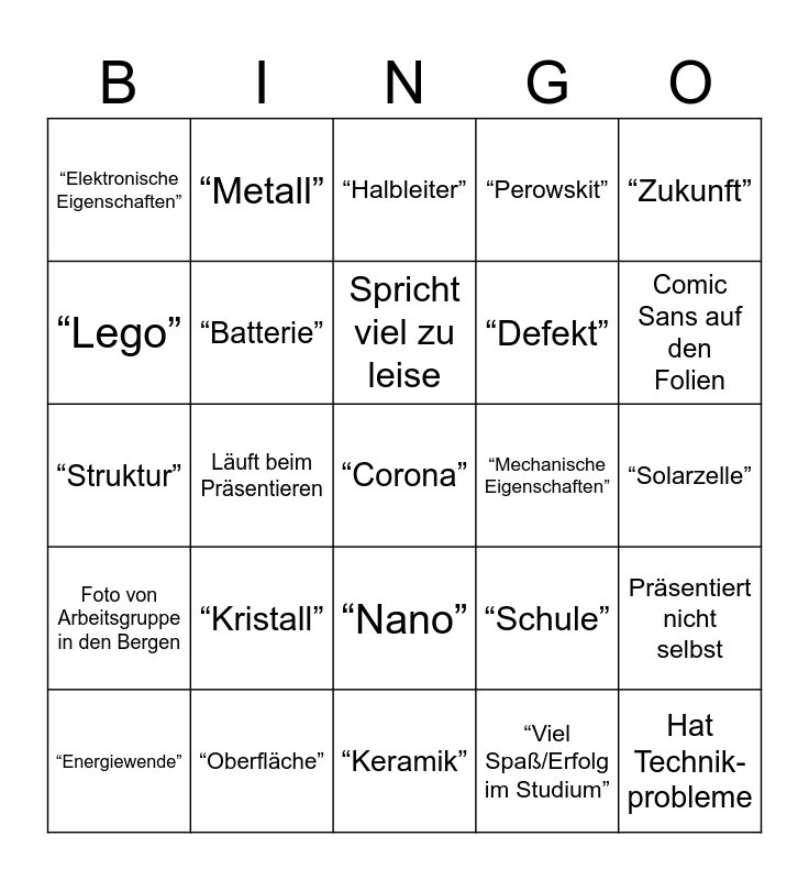 This bingo card has 25 words: “Kristall”, “Keramik”, Spricht viel zu leise, “Energiewende”, “Zukunft”, “Elektronische Eigenschaften”, “Lego”, “Metall”, “Mechanische Eigenschaften”, “Nano”, “Defekt”, “Struktur”, “Schule”, Präsentiert nicht selbst, “Batterie”, Hat Technik- probleme, “Solarzelle”, “Halbleiter”, Comic Sans auf den Folien, Läuft beim Präsentieren, “Corona”, “Oberfläche”, Foto von Arbeitsgruppe in den Bergen, “Perowskit” and “Viel Spaß/Erfolg im Studium”.