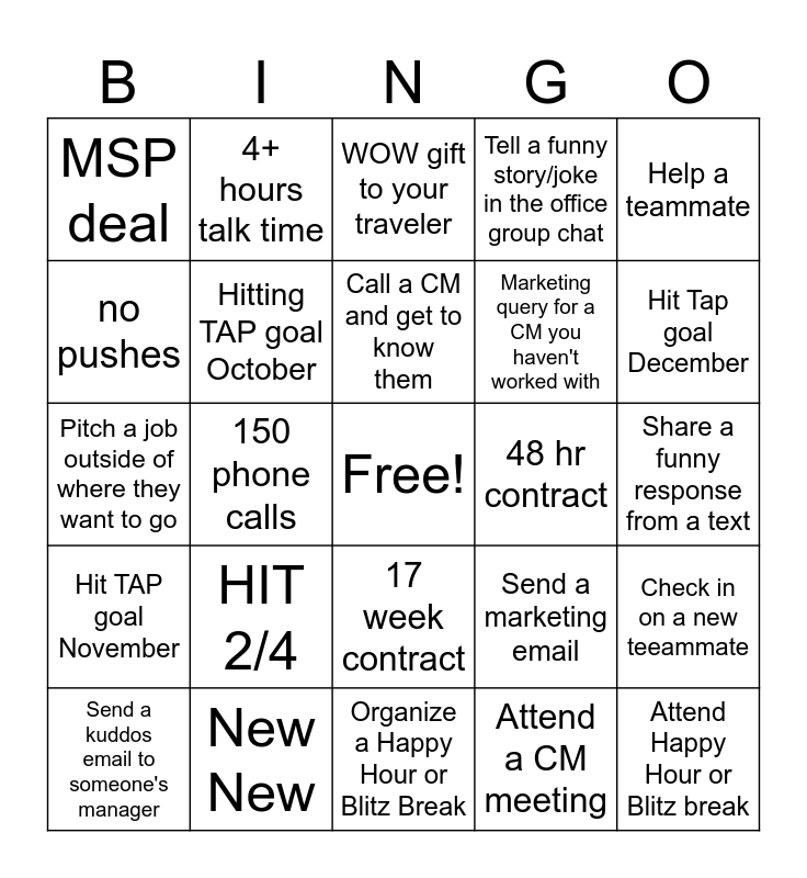 This bingo card has a free space and 24 words: HIT 2/4, New New, Call a CM and get to know them, Send a kuddos email to someone's manager, Help a teammate, MSP deal, no pushes, 4+ hours talk time, 48 hr contract, 17 week contract, Marketing query for a CM you haven't worked with, Pitch a job outside of where they want to go, Send a marketing email, Check in on a new teeammate, Hitting TAP goal October, Attend a CM meeting, Share a funny response from a text, WOW gift to your traveler, Hit Tap goal December, 150 phone calls, Attend Happy Hour or Blitz break, Hit TAP goal November, Tell a funny story/joke in the office group chat and Organize a Happy Hour or Blitz Break.