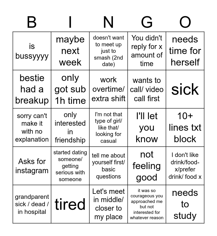 This bingo card has a free space and 24 words: started dating someone/ getting serious with someone, tired, work overtime/ extra shift, grandparent sick / dead / in hospital, needs time for herself, is bussyyyy, bestie had a breakup, maybe next week, I'll let you know, tell me about yourself first/ basic questions, wants to call/ video call first, sorry can't make it with no explanation, not feeling good, I don't like drink/food-x/prefer drink/ food x, only got sub 1h time, it was so courageous you approached me but not interested for whatever reason, 10+ lines txt block, doesn't want to meet up just to smash (2nd date), sick, only interested in friendship, needs to study, Asks for instagram, You didn't reply for x amount of time and Let's meet in middle/ closer to my place.