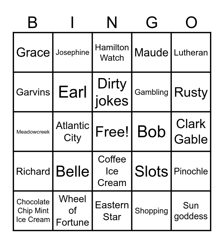 This bingo card has a free space and 109 words: Gigi, Bonnie, Bob, Harold, George, Kim, Jenny, Mike, Kris, Ally, Julia, Justin, Caroline, Colton, Joey, Grady, Meadowcreek, Harnish Hills, German, Penn State Football, Pinochle, Lambrusco, Sewing, Books, Puzzles, Dirty jokes, Lutheran, Garden, Sports, Books, Rusty, Maude, Hamilton Watch, New York City, Ocean City, Sun goddess, Fashionista, St Joseph Street, Wheel of Fortune, CNN, Austria, Cruising, Gambling, Atlantic City, Slots, Stuart, Florida, The Worlds Fair, Jeopardy, Boscovs, Chicos, Olive Garden, Shopping, Coconut, Emmanuel Lutheran, Trinity Lutheran, Josephine Gloria Kuhn, 12-Oct-23, Lavinia, Earl, Grace, Paul, John, Margaret, Irene, James, Emma, Viola, Elsie, Lester, Betty, Josephine, Richard, Robert, Edward, Thomas, Clark Gable, Andrea Bocelli, Lobster Tail, Ice cream, Thornbirds, Pretzels and cheese, Olive Garden, Rose, How great thou art, RCA, Country Casuals, Schick, Garvins, Columbia Ave, Lime Street, Belle, Cup cheese, Field Hockey, Christmas, 16-Jan-43, Fasnachts, Girl Scout Leader, Eastern Star, Fast Driver, Purse Obsession, Shoe Obsession, Chocolate Chip Mint Ice Cream, Coffee Ice Cream, Chippendales, JFK Inauguration, Poll Worker, Bahamas and Jimmies.