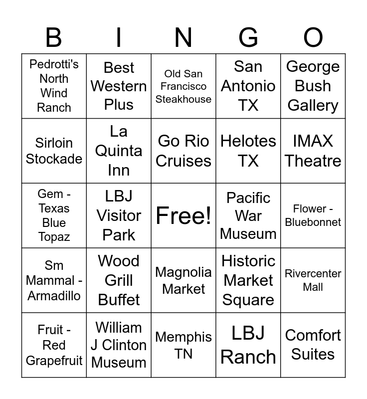 This bingo card has a free space and 50 words: Murfreesboro TN, Comfort Suites, Nat Ornamental Museum, Memphis TN, Wood Grill Buffet, Benton AR, Best Western Plus, Texarkana AR, Sirloin Stockade, Round Rock TX, La Quinta Inn, San Antonio TX, Rivercenter Mall, Historic Market Square, Cafe Ole Restaurant, Riverwalk, Go Rio Cruises, Pacific War Museum, Fredericksburg TX, George Bush Gallery, LBJ Visitor Park, LBJ Ranch, Pedrotti's North Wind Ranch, Helotes TX, Mission San Jose, Institute of Texan Cultures, IMAX Theatre, Alamo, Old San Francisco Steakhouse, Magnolia Market, Waco TX, food trucks, Buca di Beppo, Dallas TX, William J Clinton Museum, Little Rock AR, Motto - Friendship, Tree - Pecan, Flag - Lone Star, Flower - Bluebonnet, Lg Mammal - Texas Longhorn, Sport - Rodeo, Bird - Mockingbird, Dog breed - Blue Lacy, Fruit - Red Grapefruit, Gem - Texas Blue Topaz, Horse - American Quarter, Insect - Monarch Butterfly, Sm Mammal - Armadillo and Song - Texas Our Texas.