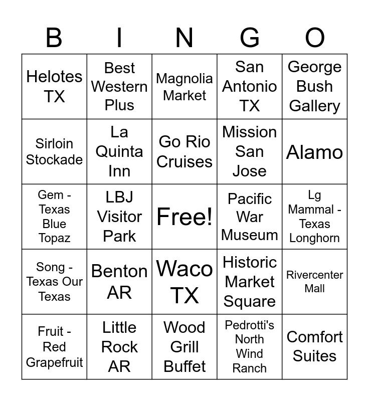 This bingo card has a free space and 50 words: Murfreesboro TN, Comfort Suites, Memphis TN, Wood Grill Buffet, Benton AR, Riverwalk, Best Western Plus, Texarkana AR, Sirloin Stockade, Nat Ornamental Museum, La Quinta Inn, San Antonio TX, Rivercenter Mall, Historic Market Square, Cafe Ole Restaurant, Round Rock TX, Go Rio Cruises, Pacific War Museum, Fredericksburg TX, George Bush Gallery, LBJ Visitor Park, Pedrotti's North Wind Ranch, Helotes TX, Mission San Jose, Institute of Texan Cultures, IMAX Theatre, Alamo, Old San Francisco Steakhouse, Magnolia Market, Waco TX, food trucks, Buca di Beppo, Dallas TX, William J Clinton Museum, Little Rock AR, Motto - Friendship, Tree - Pecan, Flag - Lone Star, Flower - Bluebonnet, Lg Mammal - Texas Longhorn, Sport - Rodeo, Bird - Mockingbird, Insect - Monarch Butterfly, Dog breed - Blue Lacy, Fruit - Red Grapefruit, Gem - Texas Blue Topaz, Horse - American Quarter, Sm Mammal - Armadillo, Song - Texas Our Texas and LBJ Ranch.