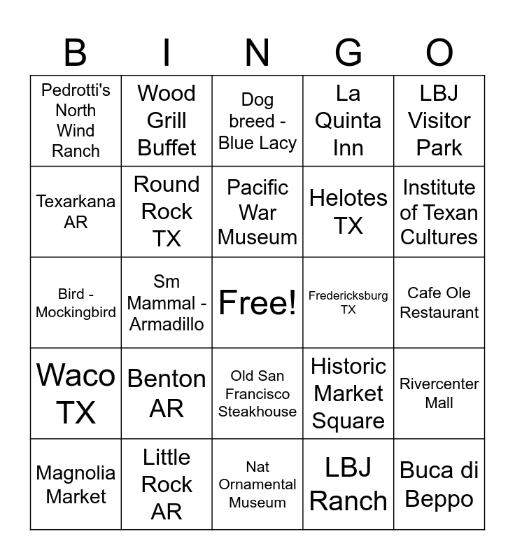 This bingo card has a free space and 49 words: Murfreesboro TN, Buca di Beppo, Comfort Suites, Nat Ornamental Museum, Benton AR, Memphis TN, Wood Grill Buffet, Best Western Plus, Texarkana AR, Sirloin Stockade, Round Rock TX, La Quinta Inn, Rivercenter Mall, Historic Market Square, Riverwalk, Go Rio Cruises, Pacific War Museum, Fredericksburg TX, George Bush Gallery, LBJ Visitor Park, Sm Mammal - Armadillo, LBJ Ranch, Pedrotti's North Wind Ranch, Helotes TX, Mission San Jose, Institute of Texan Cultures, Magnolia Market, Alamo, Old San Francisco Steakhouse, Waco TX, food trucks, Song - Texas Our Texas, Dallas TX, William J Clinton Museum, Little Rock AR, Motto - Friendship, Tree - Pecan, Flag - Lone Star, Cafe Ole Restaurant, Flower - Bluebonnet, San Antonio TX, Lg Mammal - Texas Longhorn, Sport - Rodeo, Horse American Quarter, Bird - Mockingbird, Dog breed - Blue Lacy, Fruit - Red Grapefruit, Gem - Texas Blue Topaz and Insect - Monarch Butterfly.