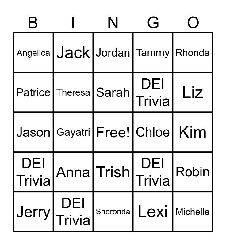 This bingo card has a free space and 24 words: Anna, DEI Trivia, Sarah, Jerry, Rhonda, Angelica, Patrice, Jack, Chloe, Trish, DEI Trivia, Jason, DEI Trivia, Robin, Theresa, Lexi, Kim, Jordan, Liz, Gayatri, Michelle, DEI Trivia, Tammy and Sheronda.