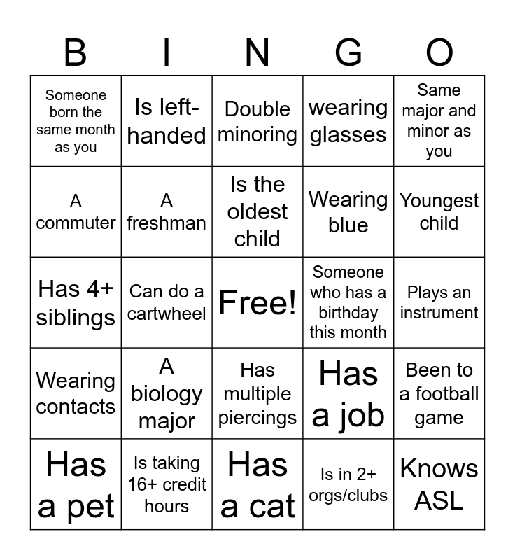 This bingo card has a free space and 24 words: A biology major, Is taking 16+ credit hours, Is the oldest child, Has a pet, Same major and minor as you, Someone born the same month as you, A commuter, Is left-handed, Someone who has a birthday this month, Has multiple piercings, Wearing blue, Has 4+ siblings, Has a job, Been to a football game, A freshman, Is in 2+ orgs/clubs, Plays an instrument, Double minoring, Youngest child, Can do a cartwheel, Knows ASL, Wearing contacts, wearing glasses and Has a cat.