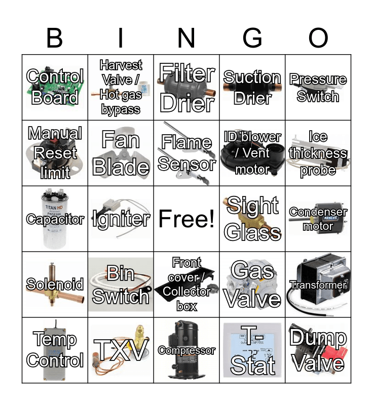 This bingo card has 25 images, a free space and 25 words: Bin Switch, Compressor, Flame Sensor, Temp Control, Pressure Switch, Control Board, Manual Reset limit, Harvest Valve / Hot gas bypass, Sight Glass, Front cover / Collector box, ID blower / Vent motor, Capacitor, Gas Valve, Transformer, Fan Blade, Blower motor, Condenser motor, Filter Drier, Ice thickness probe, Igniter, Dump Valve, TXV, Solenoid, Suction Drier and T-Stat.