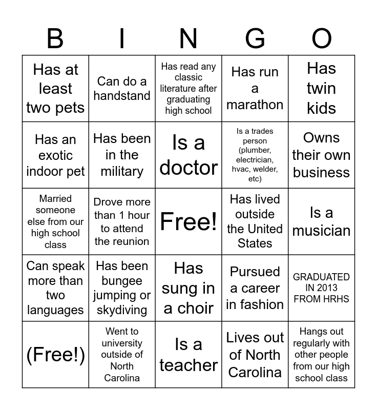 This bingo card has a free space and 26 words: Has sung in a choir, Lives out of North Carolina, Is a doctor, Went to university outside of North Carolina, Has twin kids, Has at least two pets, Has an exotic indoor pet, Can do a handstand, Is a musician, Pursued a career in fashion, Is a trades person (plumber, electrician, hvac, welder, etc), Married someone else from our high school class, GRADUATED IN 2013 FROM HRHS, (Free!), Drove more than 1 hour to attend the reunion, Owns clothing from high school, Has run a marathon, Can speak more than two languages, Has read any classic literature after graduating high school, Hangs out regularly with other people from our high school class, Owns their own business, Is a teacher, Has lived outside the United States, Has been bungee jumping or skydiving, Has been in the military and Has been to every reunion.