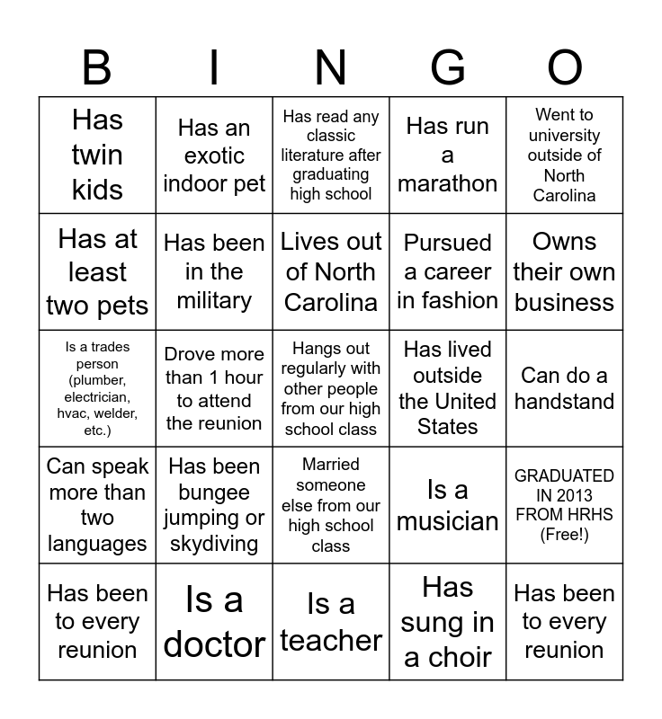 This bingo card has 26 words: Married someone else from our high school class, Has sung in a choir, Lives out of North Carolina, Is a doctor, Went to university outside of North Carolina, Has twin kids, Has at least two pets, Has an exotic indoor pet, Can do a handstand, Is a musician, Pursued a career in fashion, Is a trades person (plumber, electrician, hvac, welder, etc.), GRADUATED IN 2013 FROM HRHS (Free!), Has been to every reunion, Drove more than 1 hour to attend the reunion, Owns clothing from high school, Has run a marathon, Can speak more than two languages, Has read any classic literature after graduating high school, Hangs out regularly with other people from our high school class, Owns their own business, Is a teacher, Has lived outside the United States, Has been bungee jumping or skydiving, Has been in the military and Has been to every reunion.