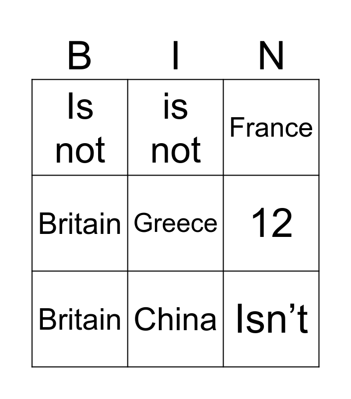 ⚠ This card has duplicate items: France (3), 10 (3), Italy (3), Britain (3), China (3), 11 (3), 12 (3), Australia (2), The USA (2), Brazil (2), Russia (2), Germany (2), Greece (2), Japan (2), Spain (2), Is not (2), Isn’t (2), Are not (2), Aren’t (2), 9 (2), 8 (2)