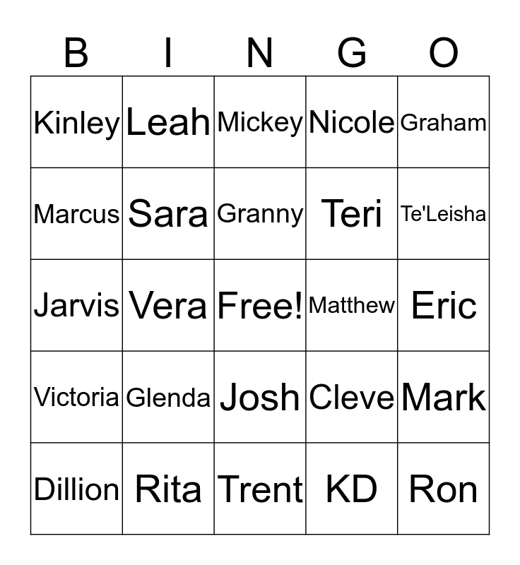 This bingo card has a free space and 24 words: Glenda, Rita, Granny, Dillion, Graham, Kinley, Marcus, Leah, Matthew, Josh, Teri, Jarvis, Cleve, Mark, Sara, KD, Eric, Mickey, Te'Leisha, Vera, Ron, Victoria, Nicole and Trent.