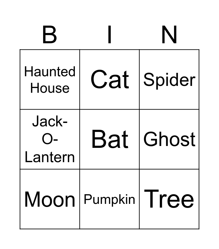 This bingo card has 10 words: Pumpkin, Spider, Haunted House, Bat, Jack-O-Lantern, Moon, Cat, Spider-Web, Ghost and Tree.