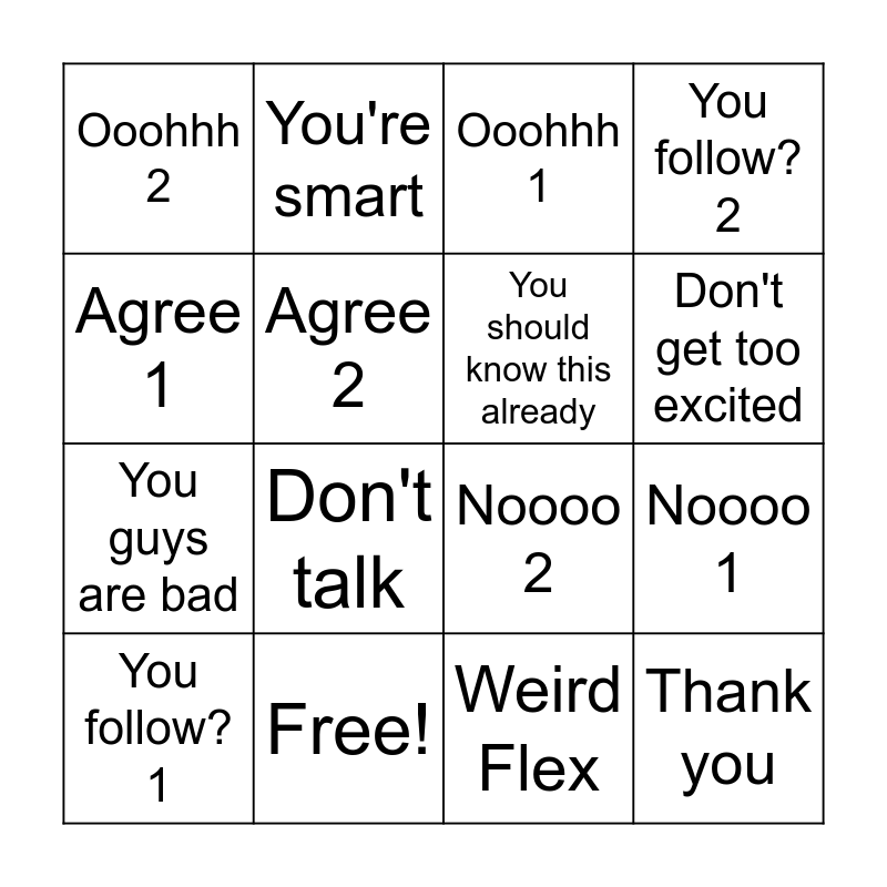 This bingo card has 16 words: Free!, Noooo 1, Ooohhh 1, Ooohhh 2, You guys are bad, You're smart, Noooo 2, Weird Flex, Agree 1, Agree 2, You follow? 1, You follow? 2, Don't talk, Don't get too excited, You should know this already and Thank you.