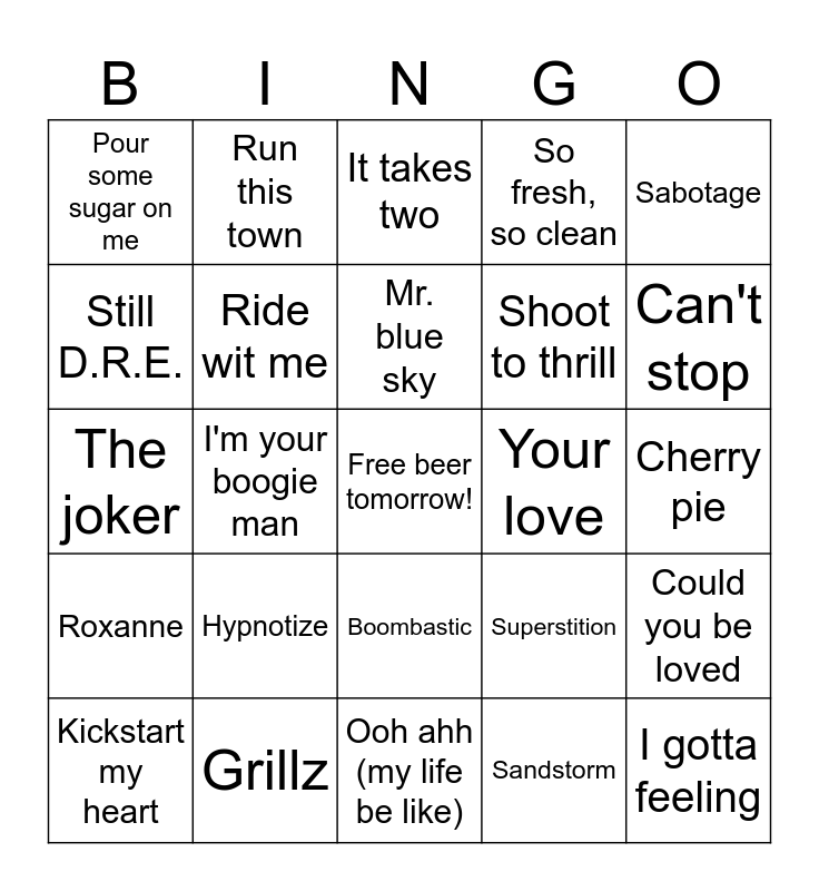 This bingo card has a free space and 49 words: Thuggish ruggish bone, I gotta feeling, Electric feel, Ooh ahh (my life be like), Hypnotize, What I can't put down, Run this town, We are young, Still D.R.E., Purple haze, Ride wit me, So fresh, so clean, Could you be loved, Superstition, Jump around, Thunder, Mr. blue sky, Your love, bad guy, Sabotage, I'm your boogie man, Sandstorm, Pour some sugar on me, Shoot to thrill, Cold as you, Can't stop, Kickstart my heart, Day N nite, Boombastic, Roxanne, Bad to the bone, The way I live, Bust a move, Play that funky music, Grillz, Panama, Broadway girls, Fortunate son, Cherry pie, Return of the mack, When I come around, Mary jane's last dance, Take the money and run, Brass monkey, The joker, It takes two, You really got me, Black hole sun and Carry on wayward son.