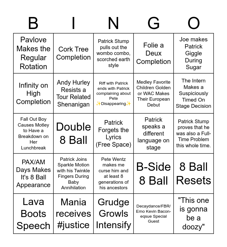 This bingo card has a free space and 24 words: Patrick Joins Sparkle Motion with his Twinkle Fingers During Baby Annihilation, Mania receives #justice, Riff with Patrick ends with Patrick complaining about Pete ✨Disappearing✨, Lava Boots Speech, Joe makes Patrick Giggle During Sugar, Pavlove Makes the Regular Rotation, Infinity on High Completion, Cork Tree Completion, Patrick speaks a different language on stage, Pete Wentz makes me curse him and at least 8 generations of his ancestors, Medley Favorite Children Golden or WAC Makes Their European Debut, Fall Out Boy Causes Motley to Have a Breakdown on Her Lunchbreak, B-Side 8 Ball, 8 Ball Resets, Andy Hurley Resists a Tour Related Shenanigan, Decaydance/FBR/ Emo Kevin Bacon-eqsue Special Guest, Patrick Stump proves that he was also a Full-Time Problem this whole time., Patrick Stump pulls out the wombo combo, scorched earth style, The Intern Makes a Suspiciously Timed On Stage Decision, Double 8 Ball, "This one is gonna be a doozy", PAX/AM Days Makes It's 8 Ball Appearance, Folie a Deux Completion and Grudge Growls Intensify.