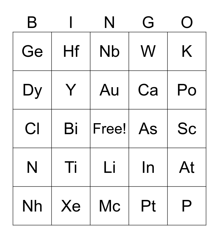 This bingo card has a free space and 24 words: Nh, Ti, Au, Pt, K, Ge, Hf, Nb, As, Sc, Cl, Y, In, At, Dy, Xe, Mc, W, Po, N, Bi, Li, Ca and P.